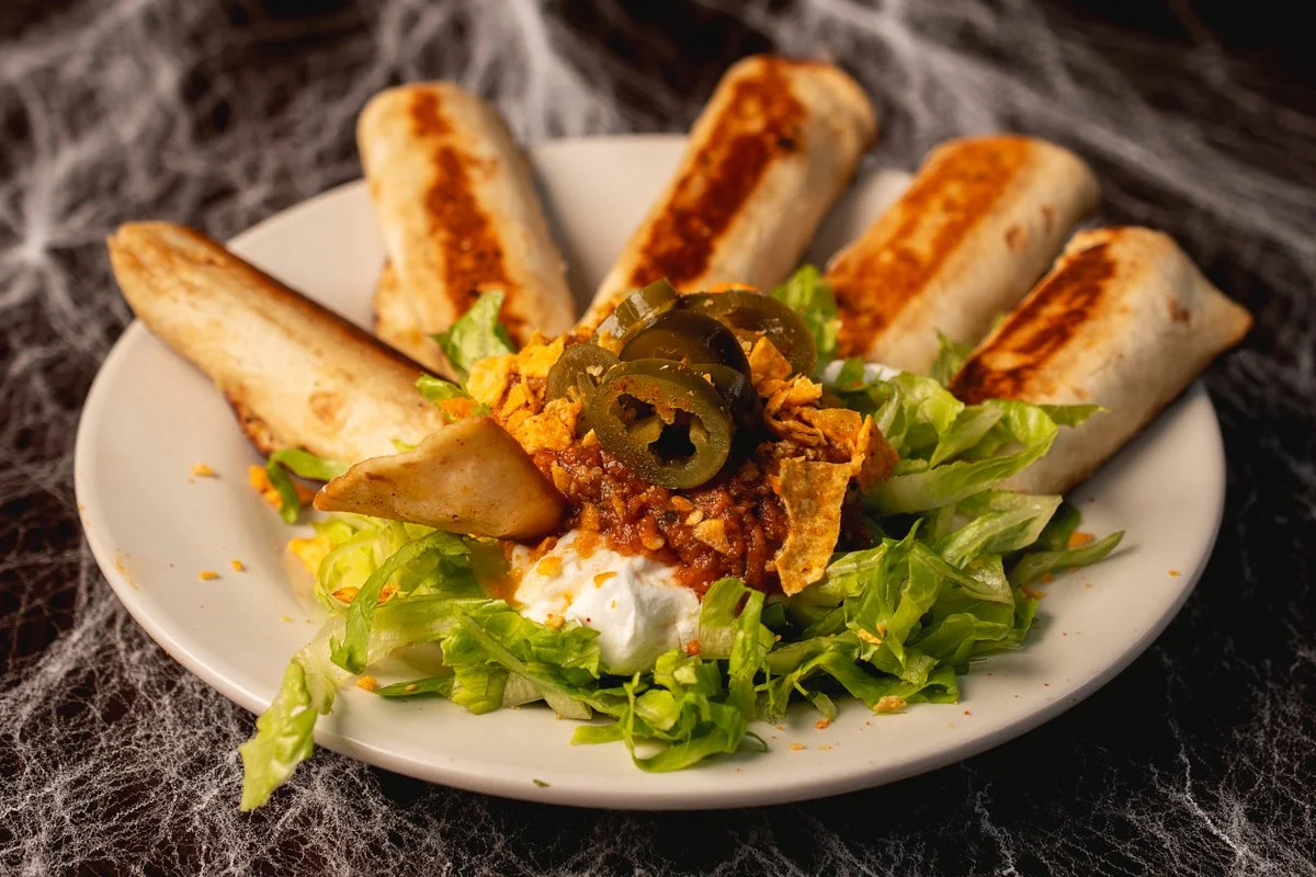 Five Buffalo Chicken and Cheddar Taquitos with side of Salsa, Sour Creme & Guacomole