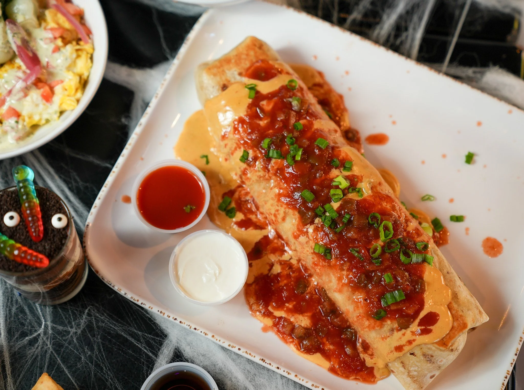 Scrambled Eggs, Bacon, Peppers & Onions, smotherd in nacho cheese & salsa with a side of sour cream & hot sauce