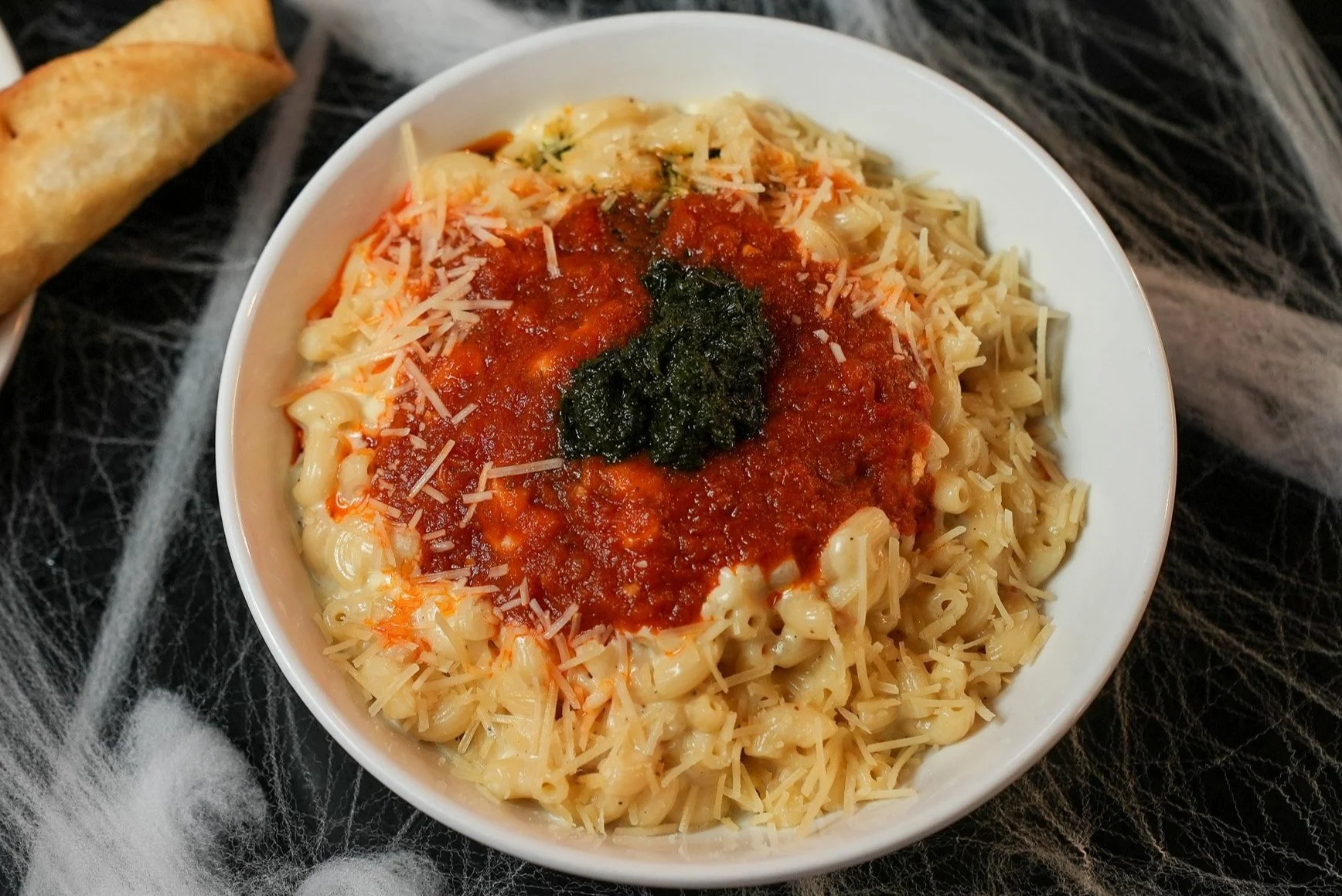 Alfredo Macaroni, Spicy Tomato Oil, Basil Pesto, Parmesan Cheese