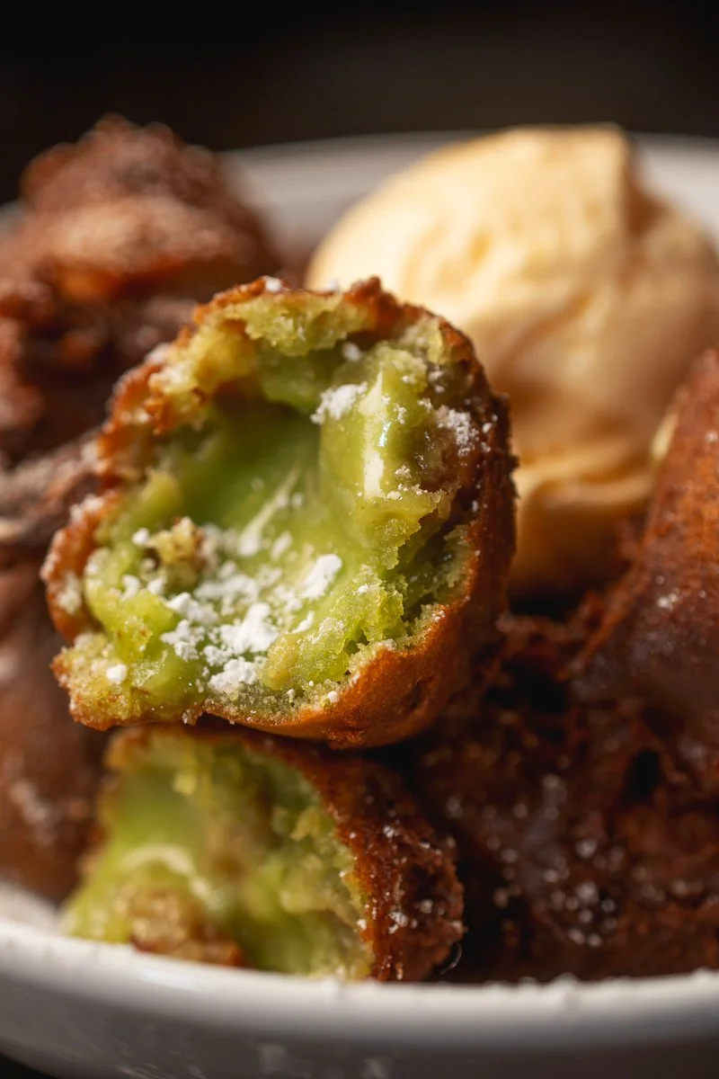 Five Deepfried Pistachio Muffin Batter Balls cooked until Molten, served with Vanilla Icecream and Powdered Sugar